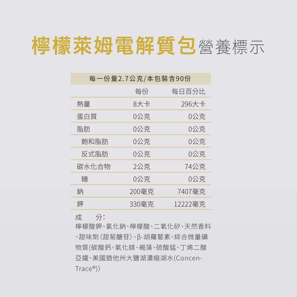 ◆商品成分:檸檬酸鉀、氯化鈉、檸檬酸、二氧化矽、天然香料、甜味劑(甜菊醣苷)、β-胡蘿蔔素、綜合微量礦物質(碳酸鈣、氧化鎂、褐藻、硫酸錳、丁烯二酸亞鐵、美國猶他州大鹽湖濃縮湖水(ConcenTrace®))