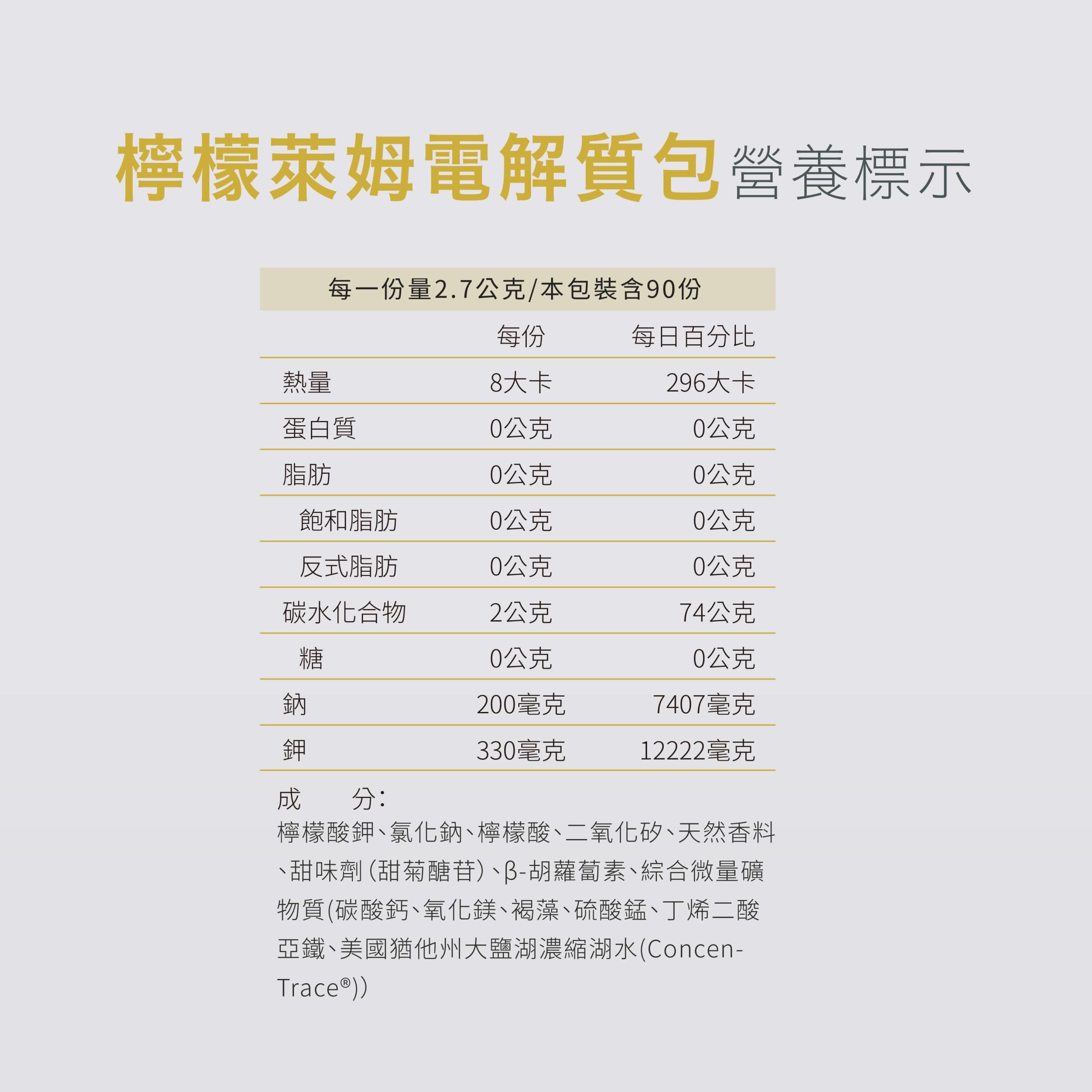 ◆商品成分:檸檬酸鉀、氯化鈉、檸檬酸、二氧化矽、天然香料、甜味劑(甜菊醣苷)、β-胡蘿蔔素、綜合微量礦物質(碳酸鈣、氧化鎂、褐藻、硫酸錳、丁烯二酸亞鐵、美國猶他州大鹽湖濃縮湖水(ConcenTrace®))