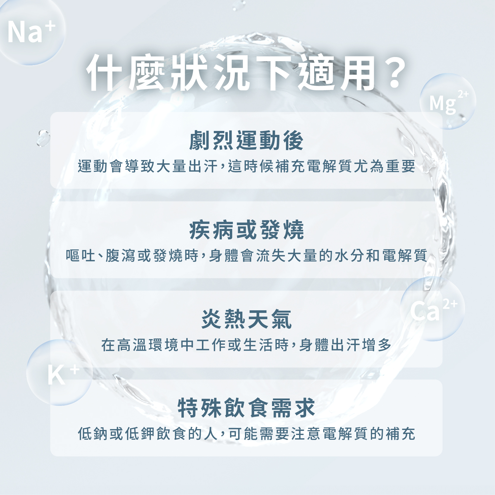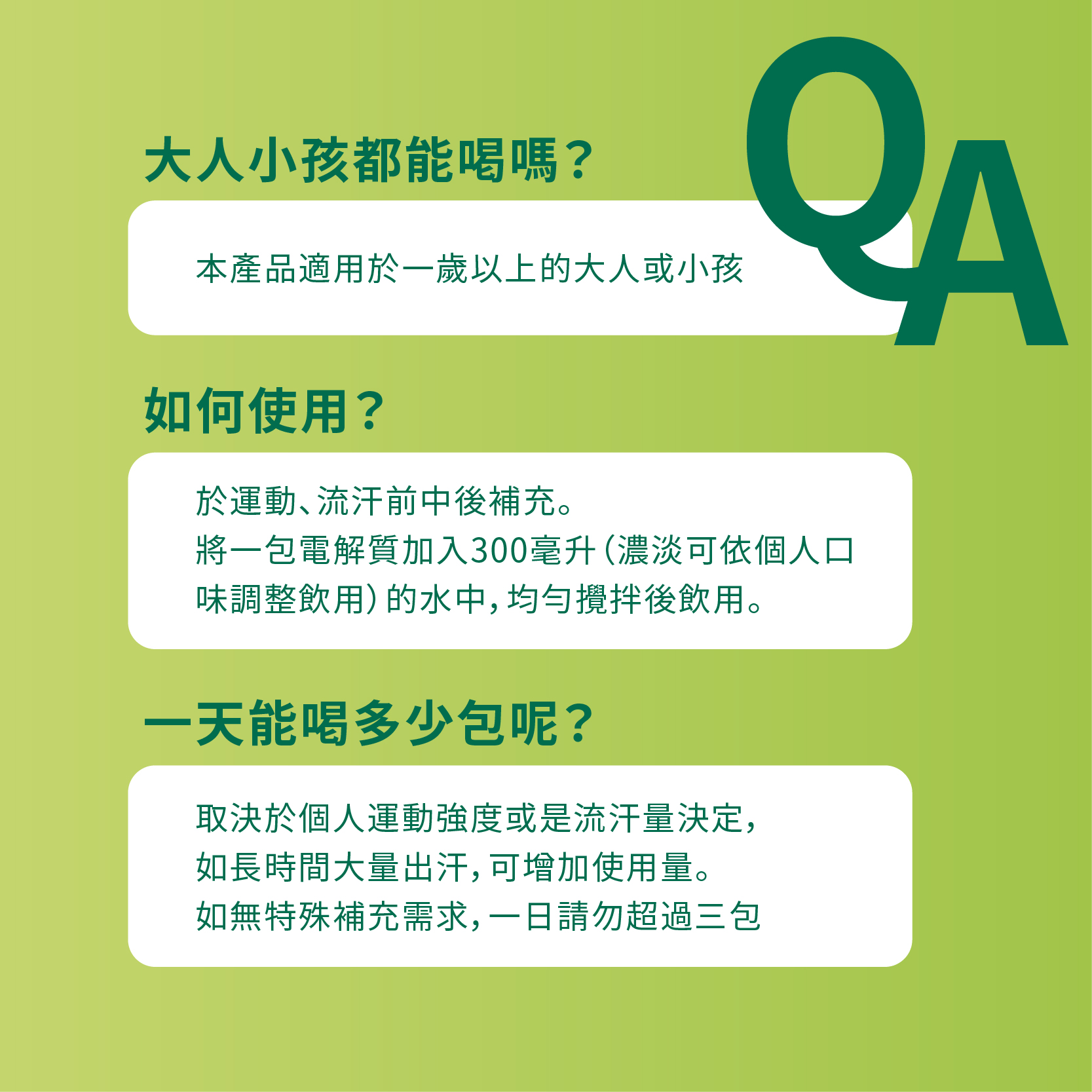 ◆食用方式:於流汗前後補充。將一包電解質加入300毫升(濃淡可依個人口味調整飲用)的水中,均勻攪拌後飲用。