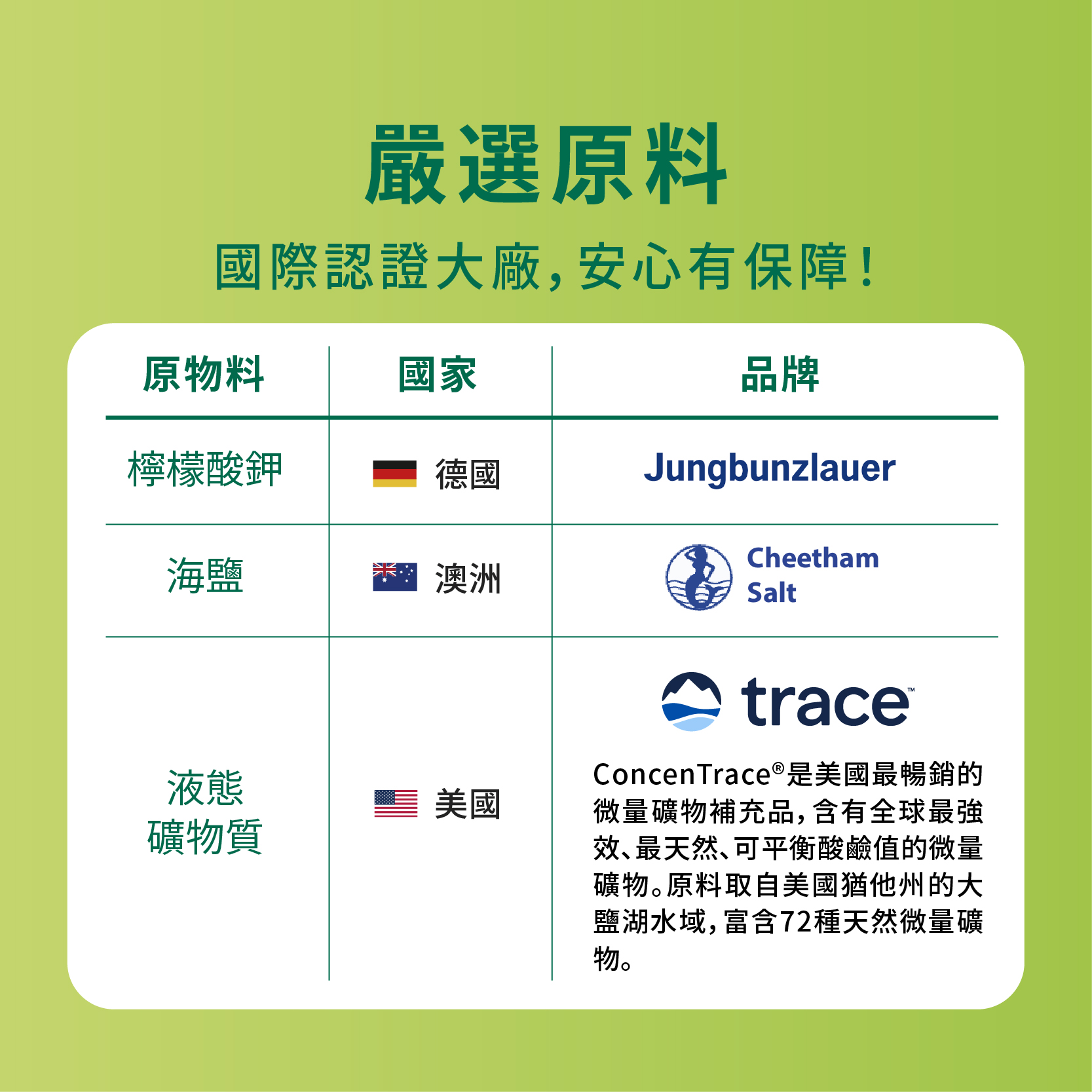 ◆商品成分:檸檬果汁粉、檸檬酸鉀、海鹽、檸檬酸、牛磺酸、維他命C、甜菊糖、美國大鹽湖濃縮湖水(ConcenTrace)