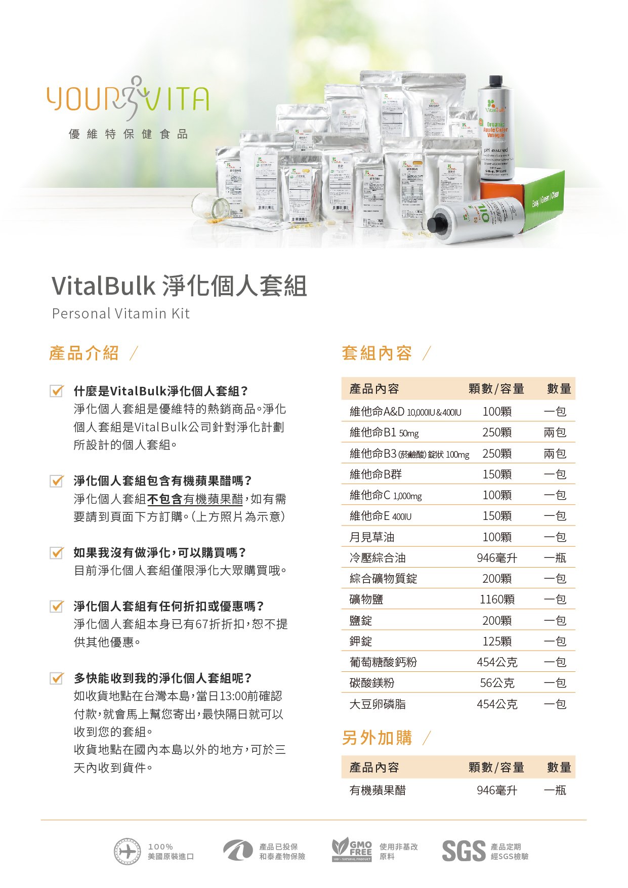 我們也提供VitalBulk淨化個人套組的單項產品,請見網站上VitalBulk的選項。