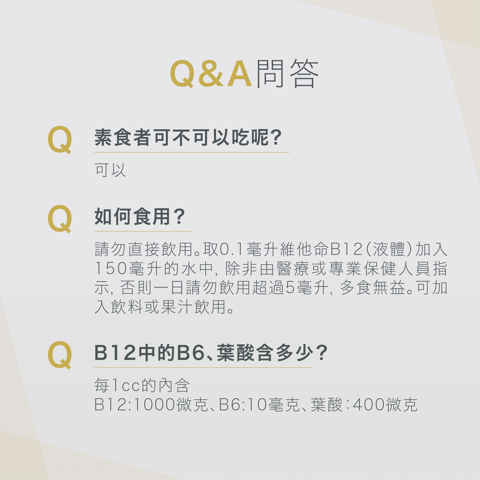 ◆營養標示算法:取0.1毫升維他命B12(液體)加入150毫升的水中,稀釋飲用5毫升