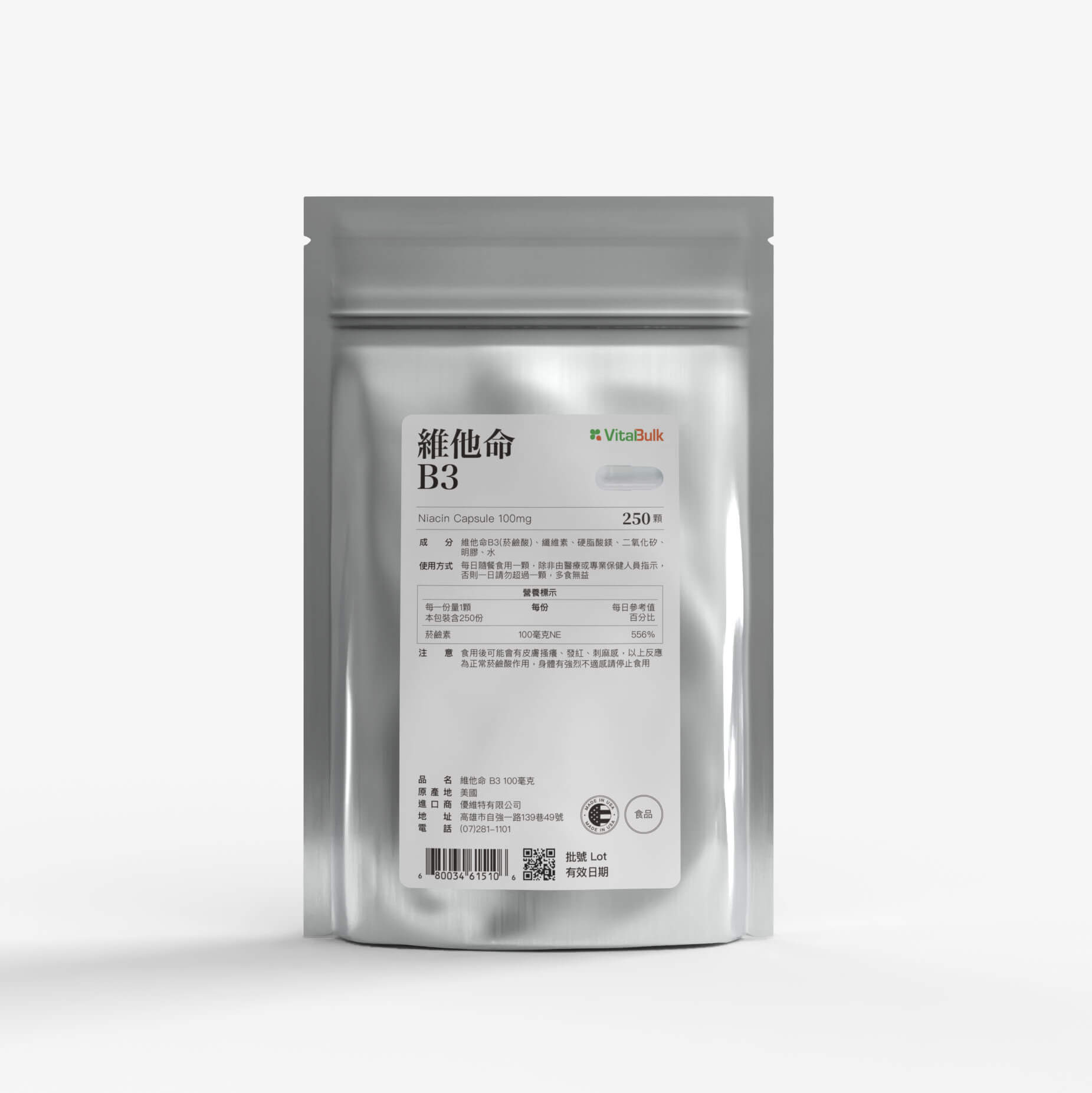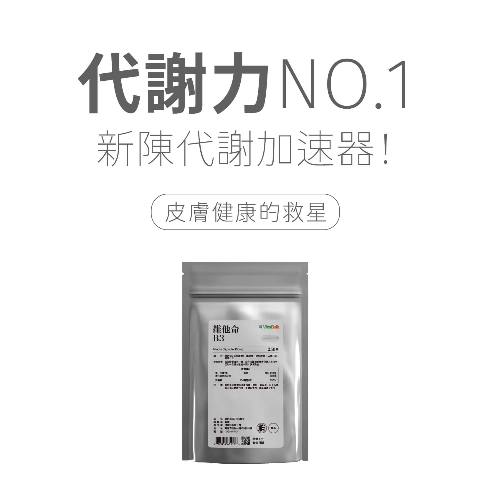◆商品名稱:VitalBulk 維他命B3 (菸鹼酸) 100mg 膠囊